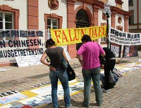 ![]() 德国拜罗伊特市中心步行街上,人们驻足了解法轮功真相和中国的三退(退出中共党、团、队)大潮 |