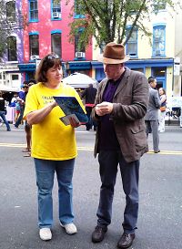 今年是法轮大法弟子连续第五年参加这个热闹的集市,告诉来往民众法轮大法的福音。“法轮大法好”的金色横幅和美丽的莲花书签把大法信息台装饰得非常美丽。