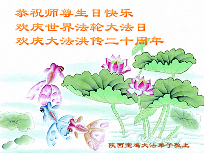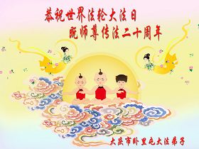 【明慧网二零一二年五月十日】二十年前的五月,李洪志师父在中国长春将法轮大法公开传出于世,二十年后的今天,法轮大法洪传全球,亿万修炼者在大法“真善忍”的指导下道德升华,获得身心健康。十三年来,每年的五月十三日,世界各地的法轮大法弟子,都向明慧网寄来贺卡贺词,庆祝“世界法轮大法日”,恭贺师尊华诞。这里是明慧编辑部已整理出来的部份来自中国大陆华东地区大法弟子的贺卡、贺信。