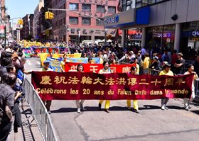 二零一二年五月十二日,数千名来自世界各地的法轮大法学员,在美国纽约唐人街举行盛大游行,庆祝法轮大法洪传二十周年,来参加游行的学员们来自五大洲,不同族裔,不同肤色,不同年龄的法轮大法学员们,纷纷用各自的方式表达修炼后身心受益的喜悦和对大法的感恩。