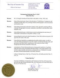 在特拉弗斯市颂扬真、善、忍。并且从今日起每年五月十三日为特拉弗斯市法轮大法日。