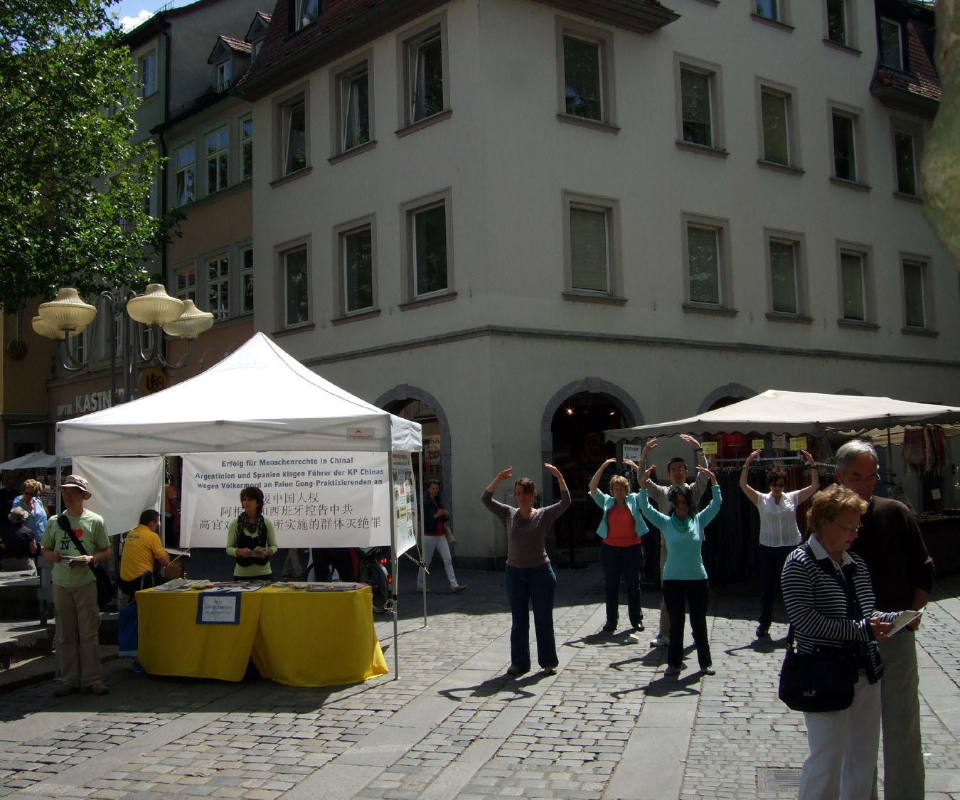 ![]() 法轮功学员们在市中心的步行街上举办真相信息日 |