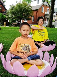 在空宁的静功音乐中,一群小鸟般活泼的孩子停止了喧闹,静悄悄地坐上正在打坐的法轮功学员身旁的莲台,认真学习双腿盘坐、手印,热心地互相帮助纠正动作,最后闭上眼睛,静静享受内心的宁静和玄妙。