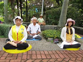 ![]() 张愫悻(前左)修炼大法后身心健康,从目不识丁到独力熟读大法书籍。图为在士林官邸炼功。 |