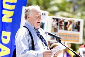 ![]() 中国问题专家、美对中政策评论家罗杰‧坎菲尔德(Roger Canfield)在集会上发言。 |