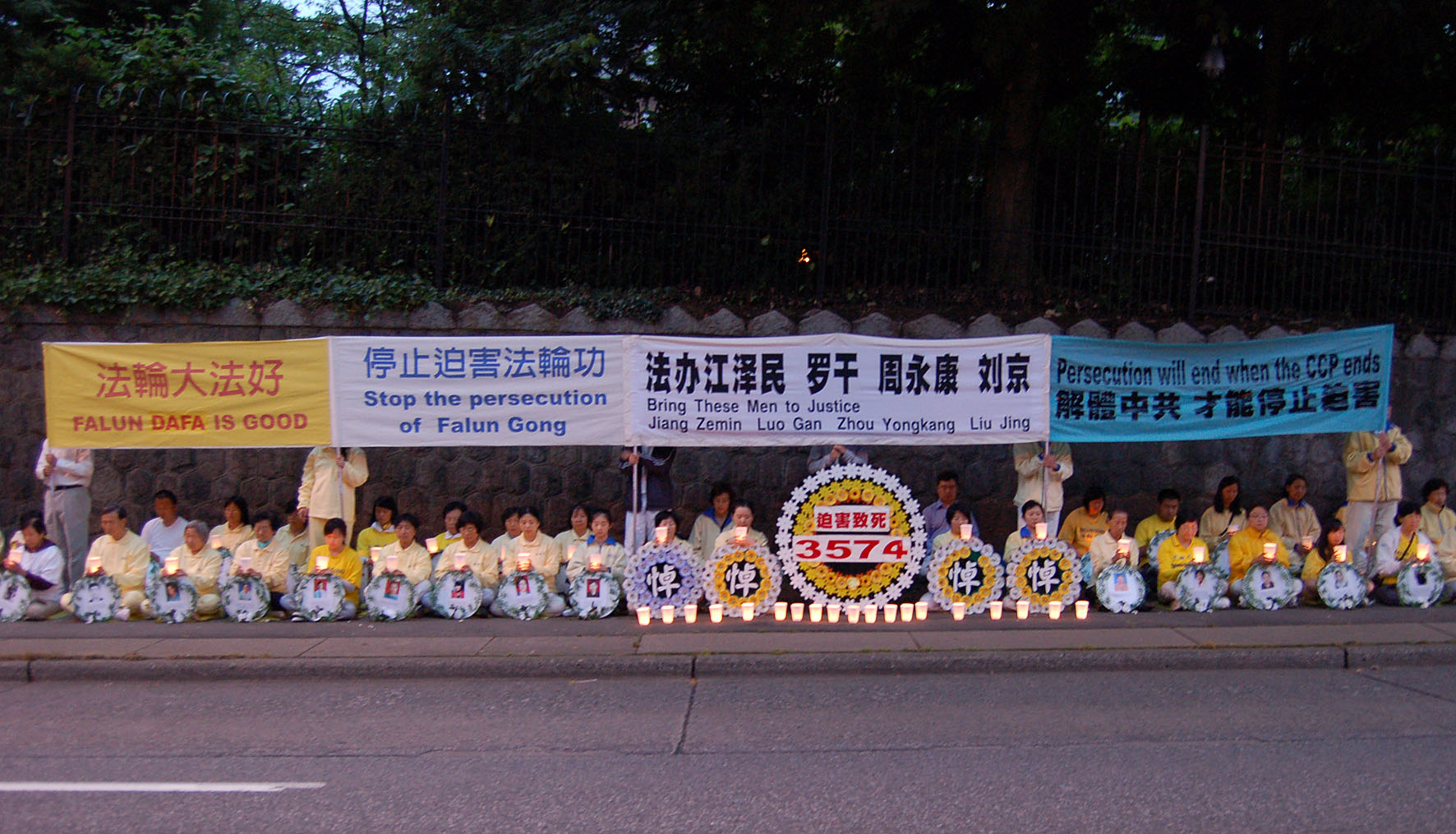 夜,已在雨中完全降临。法轮功学员点起了点点烛光,悼念因坚持修炼而被迫害致死的中国大陆同修。烛光虽小,但它闪烁的光芒,却在黑暗中带来光明,就如同坚持不懈告诉世人真相的法轮功学员,给中国人带来希望。