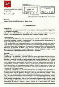此前,托斯卡纳大区议会也于六月十三日一致通过了一项类似的决议,要求中共停止对法轮功的迫害。在大区议会投票的当天,意大利法轮功学员在大区议会的门外组织了一次声援活动,支持议员们做出正确的选择。学员们在门外挂起了一条横幅,上书“保护人权,通过决议,停止迫害法轮功”。