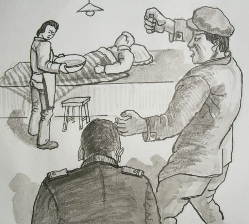 中共酷刑示意图:背铐、电击、棒打、踩踢