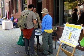 有一对美国夫妇,本来是来宣传基督教的,也过来问我们大法的情况,问大法和他们基督教有什么区别。听了我们详细的介绍后,他们十分感兴趣,要了真相传单和报纸,表示要回去好好了解了解。一个女士看到我们的展板特意上前来,说她早就听说法轮大法现在在中国是被禁止的,她倒要看看大法是怎么一回事,为什么会被禁止。我们告诉她大法被禁止的原因就是因为大法好、学员多,引起中共的嫉恨和恐慌才被禁后,她大为震惊,表示回去一定要上介绍大法的网站好好了解一下,也要向周围的人解释大法中国被禁的原因。很多人在跟学员交谈后表示想学功,学员就提供了联系方式,告诉他们想学的话可以随时联系,完全免费教功,也可以上法轮大法网站上先自学,有问题再联系学员。