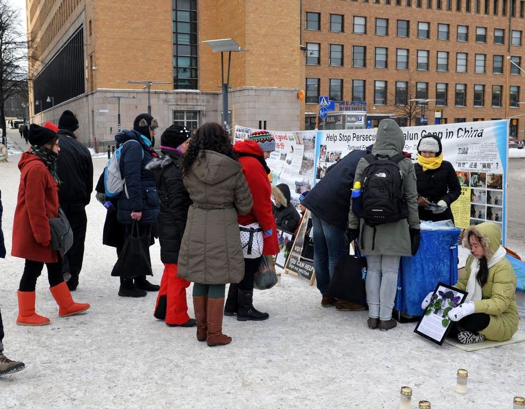在一月二十七日晚赫尔辛基烛光守夜和平反迫害活动过程中,匆忙走过的人们大多会停下来,关注法轮功在中国大陆遭到的严酷迫害。