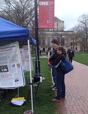 四月的哥伦布市天气逐渐回暖,人们渐渐感受到春天的气息,俄亥俄州立大学的Oval绿地周围也是一片春日荣景。Oval绿地是校园内著名的学生活动场所,也是俄亥俄州立大学校园内最忙碌的地方,每天都有各色不同的学生活动在这里举行,也是许多学生和教师去往教室及图书馆的必经之路,学生们在闲暇之余也会来到这里的绿地上放松休息片刻。法轮功学员们就是在oval绿地的中心位置搭起帐篷和展台,摆上展板和图片,向过往的民众揭露已经在中国持续十四年之久的对法轮功学员的残酷迫害和血腥活摘罪行。
