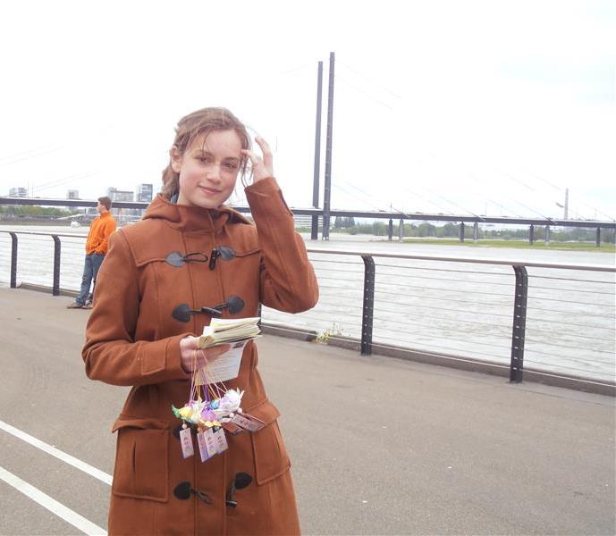 十九岁的达尼埃拉(Daniela)是个德国女学生,高中毕业,正在准备上大学的各项考试,今天也抽时间来参加庆祝法轮大法日活动。达尼埃拉得法刚刚半年,说到她得法的缘由,她说:“我一直在找一个衡量什么是好的标准,找来找去,一个这样一个那样,没有真正的标准,我都找不下去了。半年前接触到法轮大法,读了《转法轮》,一下发现,这就是我要找的,我找到衡量什么是好的标准了,我前面的路一下就开阔 了。读《转法轮》对我很重要。”