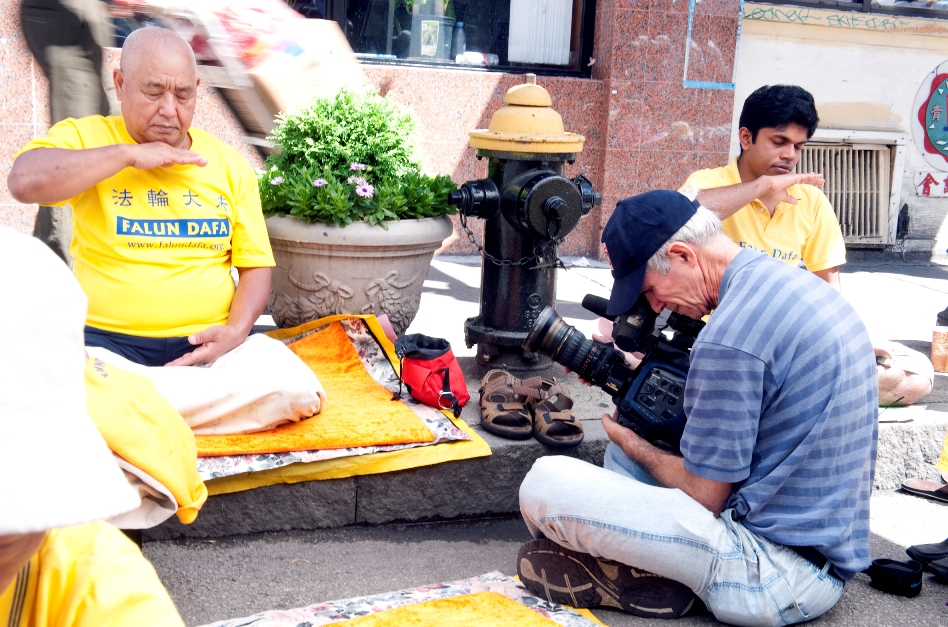 络绎不绝的人群驻足观望法轮功功法演示并摄影留念。有些人甚至要求许可拍照,从而回家自己学习法轮功。一位即将回国的上海老太太,拍摄法轮功学员炼功,并说“我不怕中共,我要带回上海给亲朋好友看”。