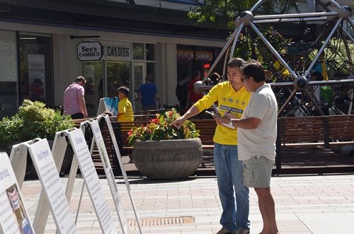 一位中年白人先生气喘嘘嘘地跑到征签桌前来说:“我可找到你们了,可否给我功法简介的传单。”原来他在偶然一次机会看到学员在户外炼功后就一直想学功。当学员告诉这先生活摘器官时,他用手按住胸口说:“我太难受了,这么美好的功法,怎会有这么可怕的迫害,听闻这样的事此刻我心痛的不能喘气。”此时的他,两眼含着泪水。