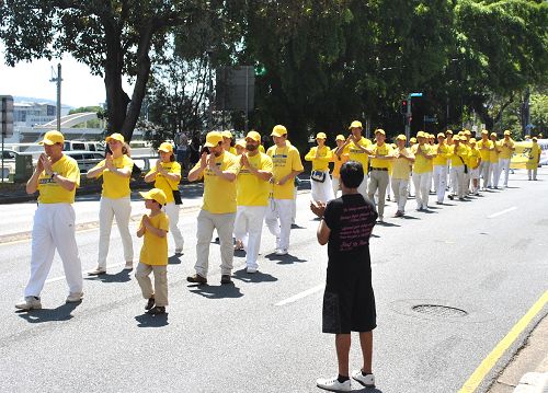 ![]() 澳洲原住民达伦•威廉斯(Daren Williams)在为法轮功游行队伍鼓掌。 |