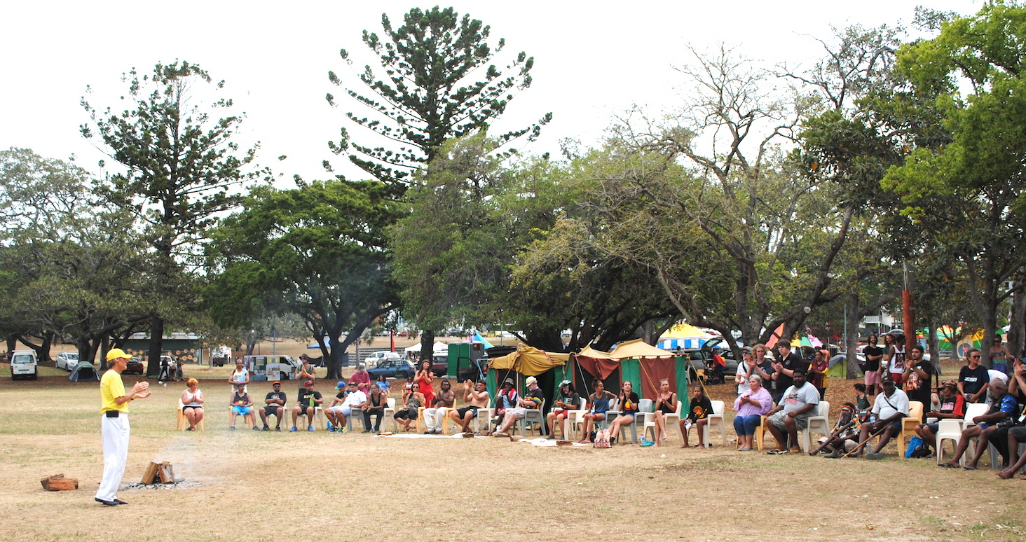 长久以来就属于澳洲原住民的营地,玛斯格瑞公园对原住民有着极其特殊的意义。在场的原住民非常感动于法轮功学员表现出来的善良与平和,因此他们特别邀请昆士兰法轮功协会的代表在他们的“神圣之圈”(sacred circle)向大家介绍法轮功及其在中国所遭受的迫害。从来不许外人随便涉足的“神圣之圈”(sacred circle)是一块对原住民而言神圣无比的土地,当法轮功学员受邀在这块土地上传播法轮功真相时,原住民还特意为他点燃“圣火”,以示对法轮功学员的尊重。