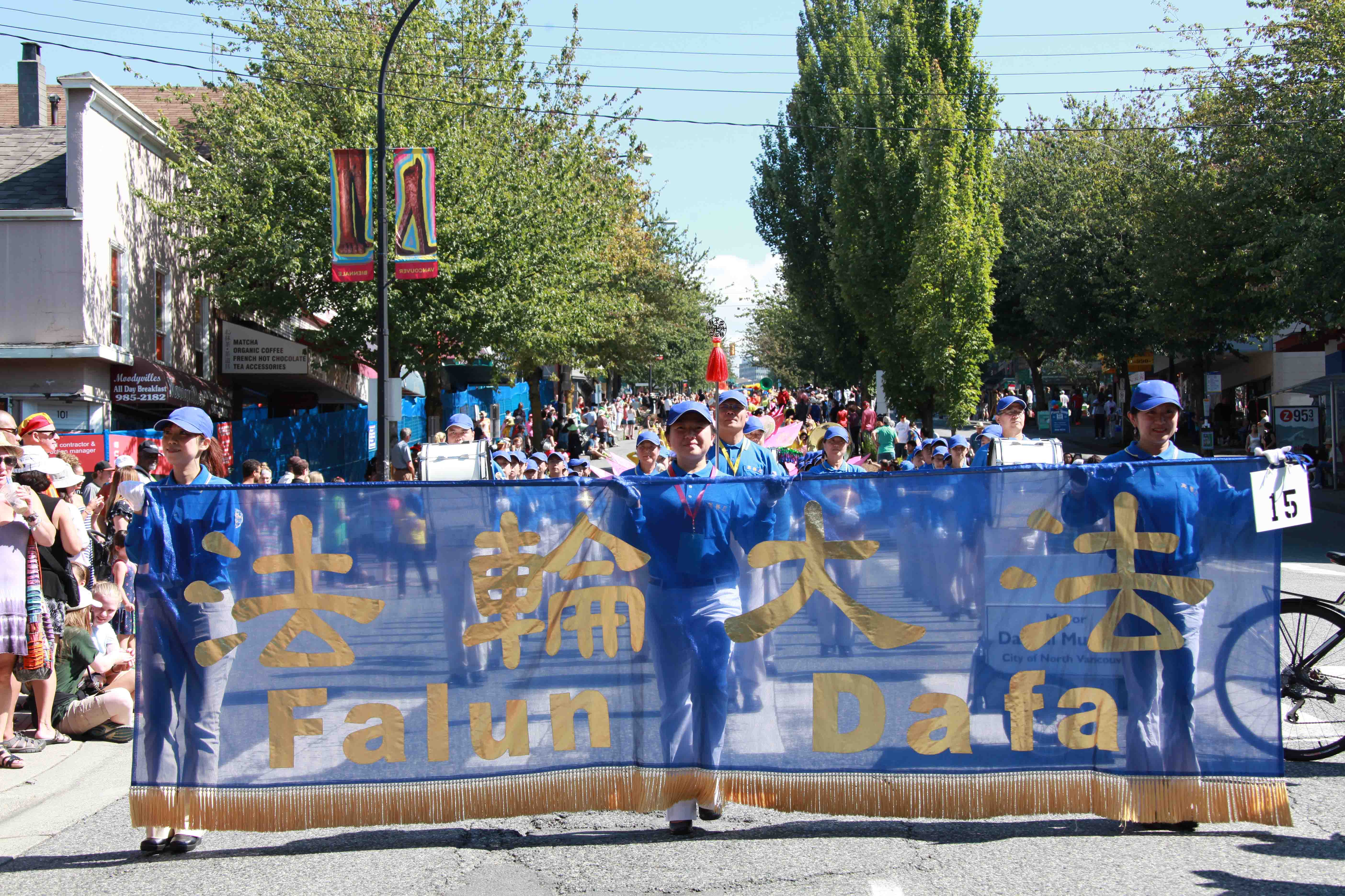 法轮功的游行队伍包括天国乐团、“真善忍”花车和法轮功功法演示队。天国乐团演奏了《永远的枫叶》、《法轮大法好》、《送宝》等乐曲,法轮功的游行队伍所过之处,受到观看游行的市民们的热烈欢迎。很多人随天国乐团的音乐起舞应和,有的市民跟随法轮功功法演示队学炼法轮功动作,有的市民兴奋地与游行队伍前排打横幅的学员击掌表示感谢和鼓励,更多的市民纷纷鼓掌和拍摄法轮大法的游行队伍。当法轮功的游行队伍走过主席台时,主持人在介绍了法轮大法后说,他们如此出色,让我们一起为法轮功热烈鼓掌。
