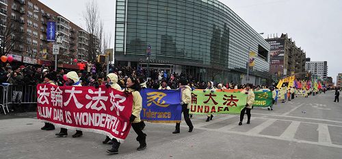 法拉盛主街两旁挤满人潮,看到法轮大法的游行队伍,他们都说好。有的人说,“今天的游行,法轮功的人最多”,也有的说:“法轮功的队伍最整齐。”