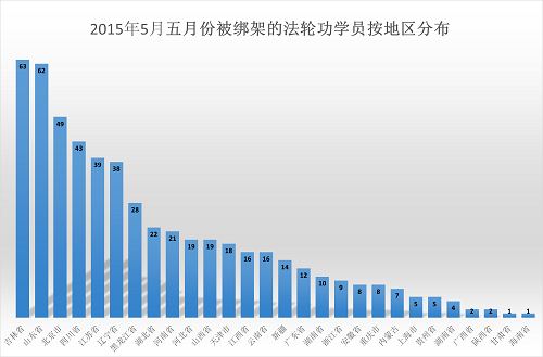 五月份绑架法轮功学员的人数排前十名的省份(直辖市):吉林省63人,山东省62人,北京市49人,四川省43人,江苏省39人,辽宁省38人,黑龙江省28人,湖北省22人,河南省21人,河北省19人,山西省19人。