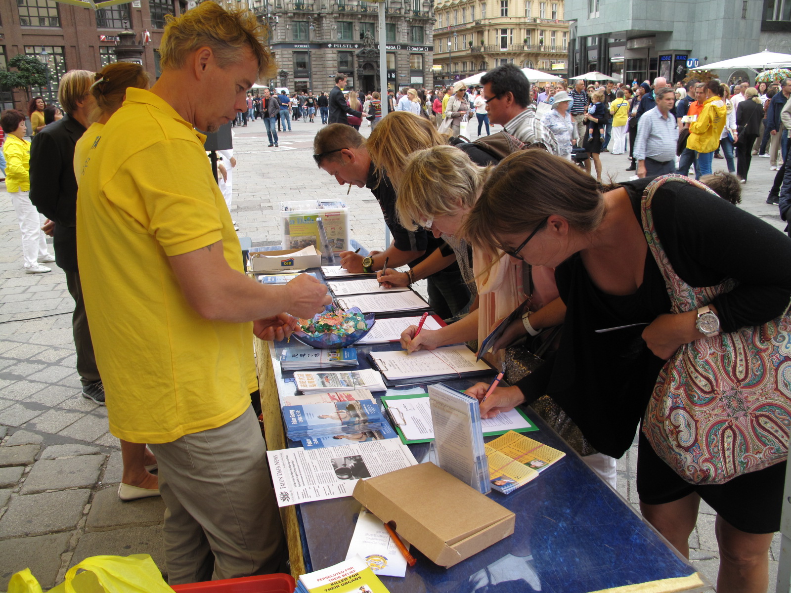 当听说有专门支持法轮功学员诉江大潮的征签表后,很多人表示愿意签名表支持。在上演讲真相街头剧的两个小时里,签名谴责中共迫害和活摘器官罪恶的人数明显增多,这些签名支持的人们包括奥地利人、德国人、荷兰人、瑞典人……