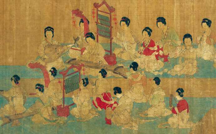 ![]() 图2:周文矩《合乐图》描绘的是古代音乐家合奏乐器。在中国古代,乐器的合奏已具规模。画上,参加合奏的乐器包括:琵琶、笙、箫、笛、钹、鼓、古筝、编钟、板……,参加合奏的达11人,如同一个小乐队。 |