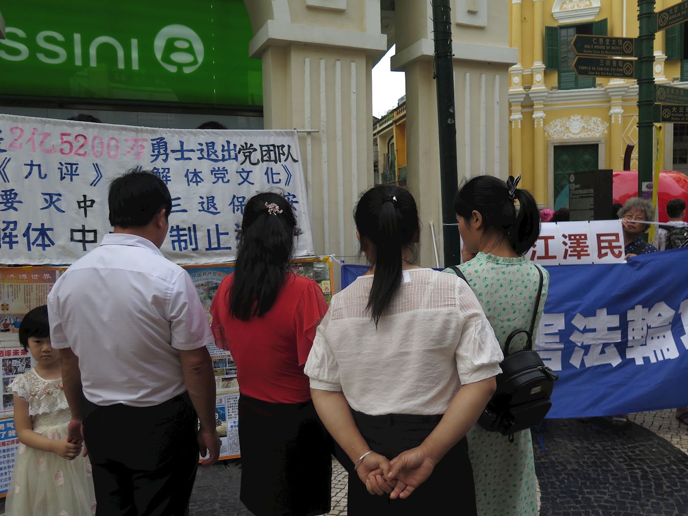 ![]() 图1-4:澳门法轮功学员要求停止迫害,法办江泽民。当地民众及大陆游客纷纷关注。 |