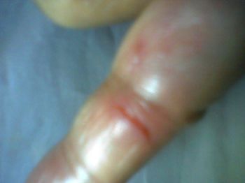 收拾客厅时,才发现我的手半边结了厚厚一层血(凝固了)。我洗去血后,才发现小指被拉开了一条口子,手指红肿,口子张着,很疼。他们既不消毒,也不止血。