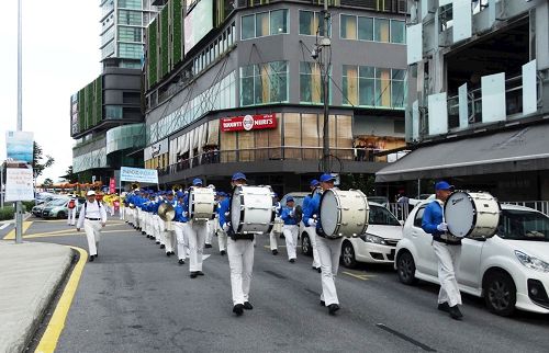 当天天气晴朗,阳光普照,法轮功学员分别来到雪兰莪州梳邦再也第十五区(Subang Jaya SS15)以及蒲种公主城(Bandar Puteri Puchong)这两个知名商业区举行游行。除了有天国乐团、舞龙队、腰鼓队之外,当天的游行队伍阵容还包括了祥和的功法示范队伍,帮助大家认识法轮功的美好。活动过程中,自愿警卫队和交通警察前来提供协助,为法轮功游行队伍开路。