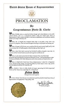 因此,我,Yvette Clarke,纽约州第九选区的国会议员,表彰李洪志先生和法轮大法。