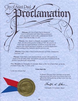 鉴于,明尼苏达州圣保罗市加入全世界法轮大法修炼者共同庆祝5月13日的世界法轮大法日;