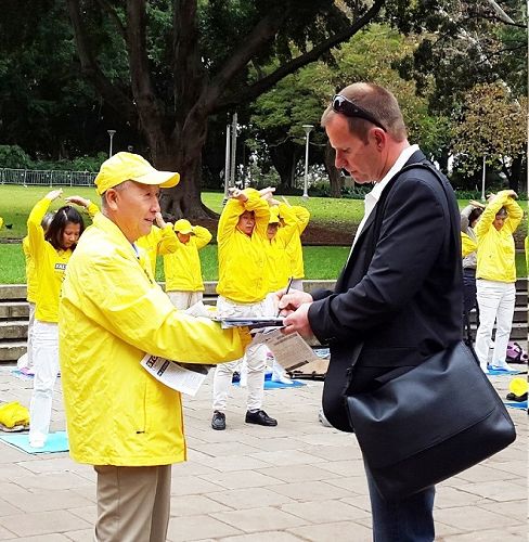 二零一六年六月十七日,从悉尼南海岸来悉尼的生意人格伦•唐金(Glen Donkin )先生路过时,主动签名支持法轮功反迫害。他感叹:几年前我就知道这事(法轮功学员被中共迫害及活摘器官)。因为我们从新闻、网络和社交中都听闻了,这事非常糟糕,它是极其恐怖的犯罪行径。我和我的朋友们都经常谈论这事,并常常会发问:为何政府可以允许这么可怕的事持续发生着?
