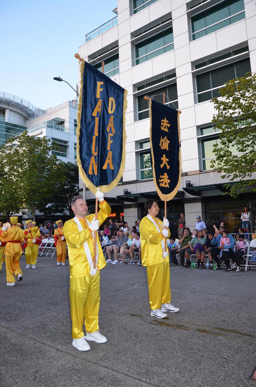 法轮大法团队早已成为炬光游行的明星,这个独特的来自“东土大唐”的游行队伍让西雅图观众充满了幻想和期待,似乎永远也看不够。法轮功团队今年是第五十九个出场,约在晚上八点半,正值夏日薄暮,夕阳西落,华灯初上,微风习习,舒爽惬意。
