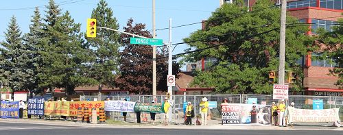 八月的多伦多非常炎热,多伦多法轮功学员从七月底开始每天、每个周末都在各个景点,市中心的路口,北部繁忙的路段,拉起横幅,大街小巷兴起了征签活动,民众的支持呼声越来越大。