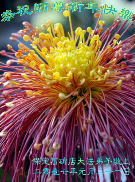 值此丁酉年新年之际,来自四川遂宁、辽宁抚顺、吉林长春、山东省威海、河北石家庄、吉林德惠、四川成都、山东招远、辽宁鞍山、湖北武汉、吉林舒兰、辽宁义县、重庆开州、湖北天门、胜利油田等七省十五地的资料点的大法弟子给慈悲伟大的李洪志师尊拜年!