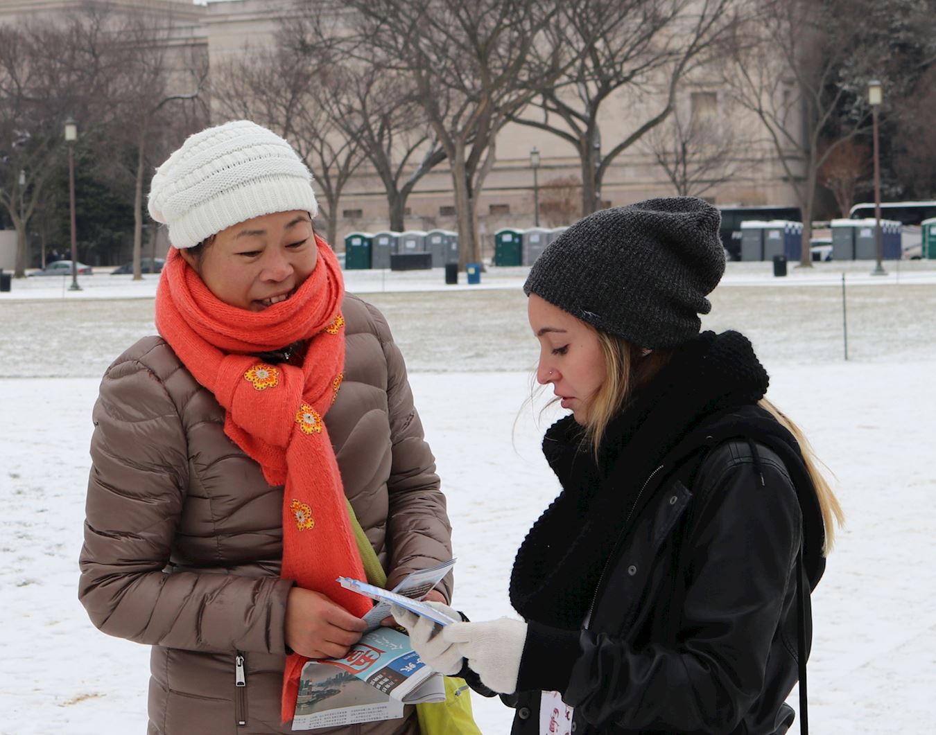 二零一七年一月七日下午,美国国家广场的大草坪被皑皑白雪覆盖,李女士在风雪中给过往的游人发法轮功真相资料,虽然穿着厚厚的棉衣,但是因为在外面站了好几个小时,她已经被寒风打透了。李女士说,她每星期都会来这里两、三天,把自己的心里话、学法轮功后的好处、在中国大陆共产党迫害法轮功的事情告诉游客。