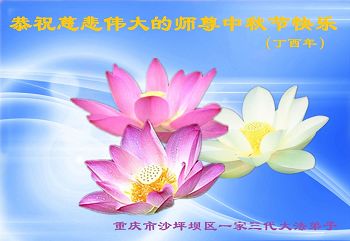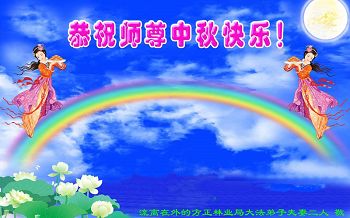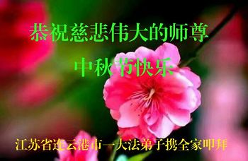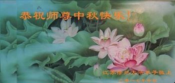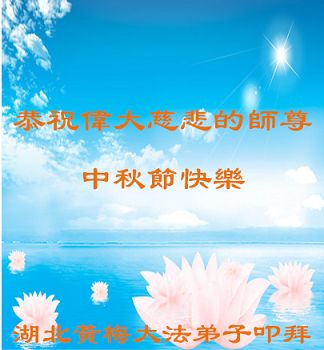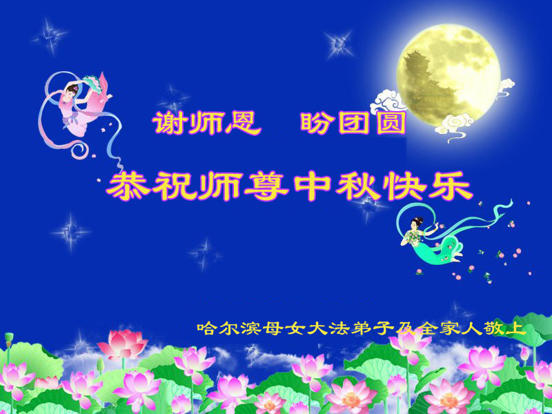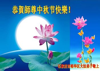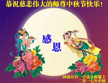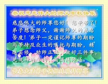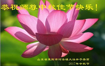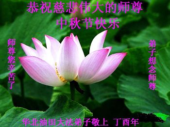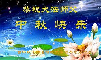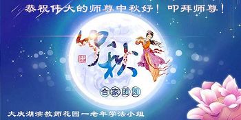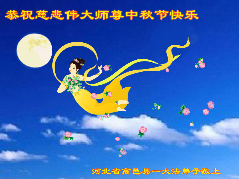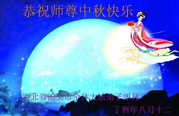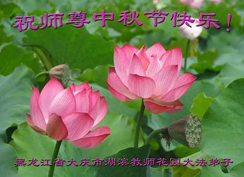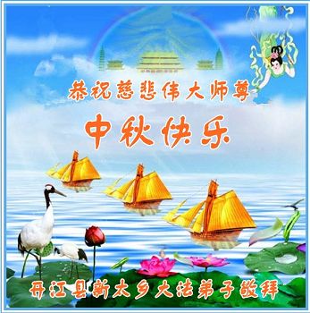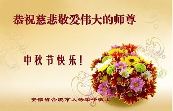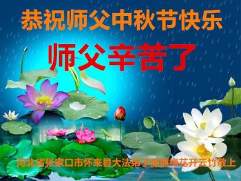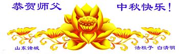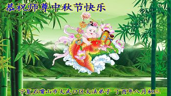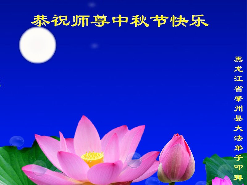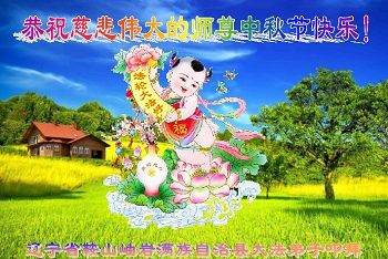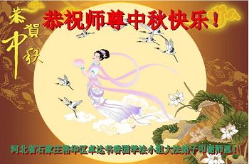 九月份,我从平房上掉下来之时,脑子里闪过九个大字“法轮大法好,真善忍好”瞬间安然无恙,我知道是您在我危难之时救了我,给了我第二次生命,使我又有了平静的生活,我无法报答您的救命之恩,只好借中秋节来临之际,祝慈悲伟大的李洪志大师中秋节快乐,谢谢您给了我这一切。“法轮大法好!真、善、忍好!”
