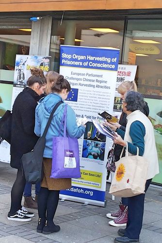 真相桌设在学生会楼(Union Building)前,许多师生在课余时到这栋楼休息。一些学生经过时拿了传单,阅读之后又回到真相桌,在制止迫害征签表上签名。一些学生看了真相传单后,又传给同班的同学看。几位医学学生在真相桌前停下脚步,阅读海报上二零一六年七月欧洲议会通过的《制止中共活摘器官的48号书面声明》介绍后说:“(中共)太可怕了!我们要签名!”