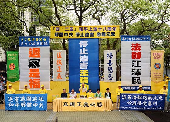香港法轮功学员以及来自亚洲多个地区和国家的部份法轮功学员,在香港港岛区举行集会游行,纪念四二五和平上访十八周年,呼吁制止迫害法轮功,法办江泽民等元凶要犯。