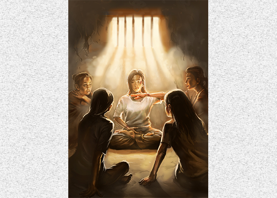 作品展现被非法关押在狱中的大法弟子在炼法轮功的第五套功法“神通加持法”,祥和的场感染同监室的人。