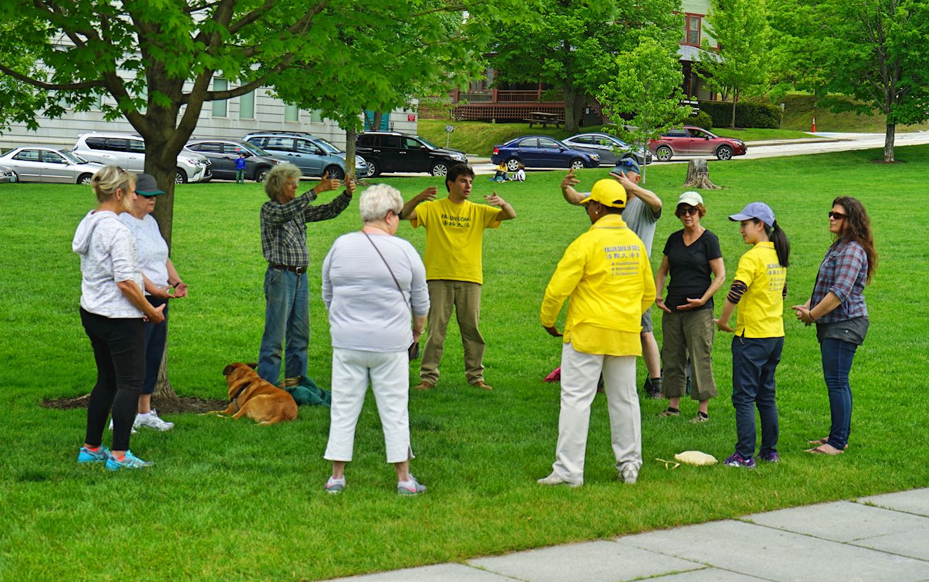 一位男士告诉学员,早期他想学针灸,没有机会。后来找老师学二胡,学了三次,老师离开当地。当天看到法轮功功法展示,很是高兴。他对中国文化很感兴趣,询问学员修炼法轮大法的好处、为什么法轮大法学员义务弘传中国传统文化等等,并敬佩学员对佛法信念的专一。