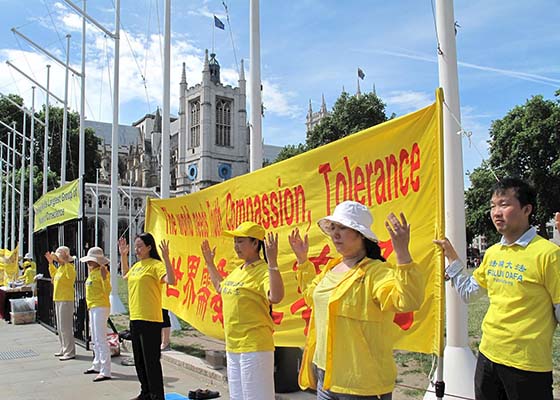 英国法轮功学员来到英国议会大厦前广场举行讲真相反迫害活动,传播法轮大法的美好、揭露中共对法轮功学员长达十八年的残酷迫害……