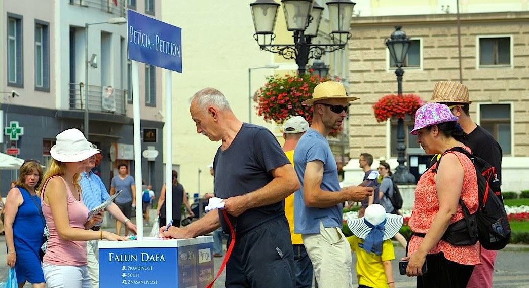 几个斯洛伐克青年,接到学员递过来的传单后,还没读完就议论上了:“这是什么事儿?也太离谱了,强行活摘器官?在中国吗?”学员答道:“是在共产党统治的中国大陆发生的事情。”他们立即说:“哇!共产党?走!我们签名去。”一行四位都在请愿书上签字表态反活摘。