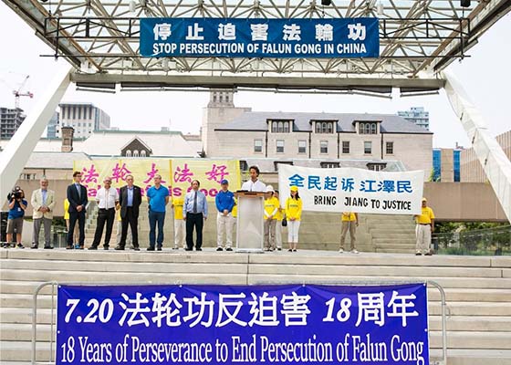 法轮功学员在多伦多市政厅的内森菲利普斯广场举行反迫害集会,数名加拿大政要到现场发言支持,赞扬法轮功学员的勇气和毅力,呼吁停止迫害。