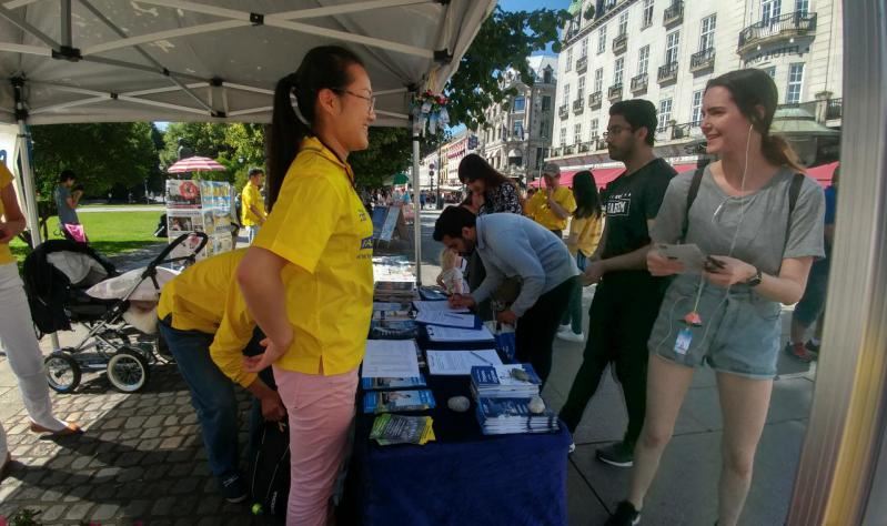 来自挪威南部城市萨普斯堡的四个学生假期来首都奥斯陆游玩,经过展位看到学员炼功很感兴趣,不由自主地跟着学炼起来。学员近而向她们讲述活摘真相。她们感到十分震惊,作为一个生长在西方自由民主国家的女孩,很难想象在中共独裁统治下会发生如此残暴的事情。