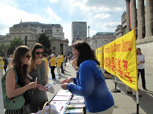 当天,英国法轮功学员又一次来到特拉法加广场,传播法轮功真相,他们打出两个巨大的真相横幅“世界需要真善忍”和“请伸出你的援手停止迫害法轮功”,把介绍法轮功基本真相的展板摆在场地前沿,其间一组身着金黄色服装的法轮功学员伴着宁静祥和的炼功音乐展示法轮功五套功法,在场地两侧各设一个信息台,并在旁边竖起反“活摘”征签展板,多位法轮功学员在人群中发传单、和民众交谈、征签。法轮功学员传递的真相信息清晰明了,而穿插进行的法轮功学员的舞龙表演引来众人目光,当天,在位于伦敦市中心的这个著名广场,法轮功真相成为人们关注焦点。