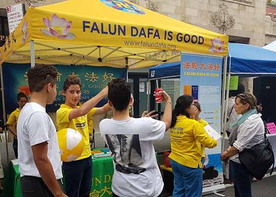 法轮功学员在展位中伴随着炼功音乐展示五套缓慢圆的功法,热情地告诉行人:法轮功教人按真善忍原则做好人,加上通过炼功能使身心健康得到提高。