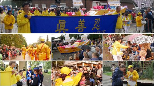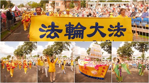 荷兰、比利时部份法轮功学员由代表中国传统文化的腰鼓队、法轮功功法展示队、莲花满船的金色大法船、以及身穿传统服饰的仙女队四部份组成,应邀参加了此次盛大花车游行活动。