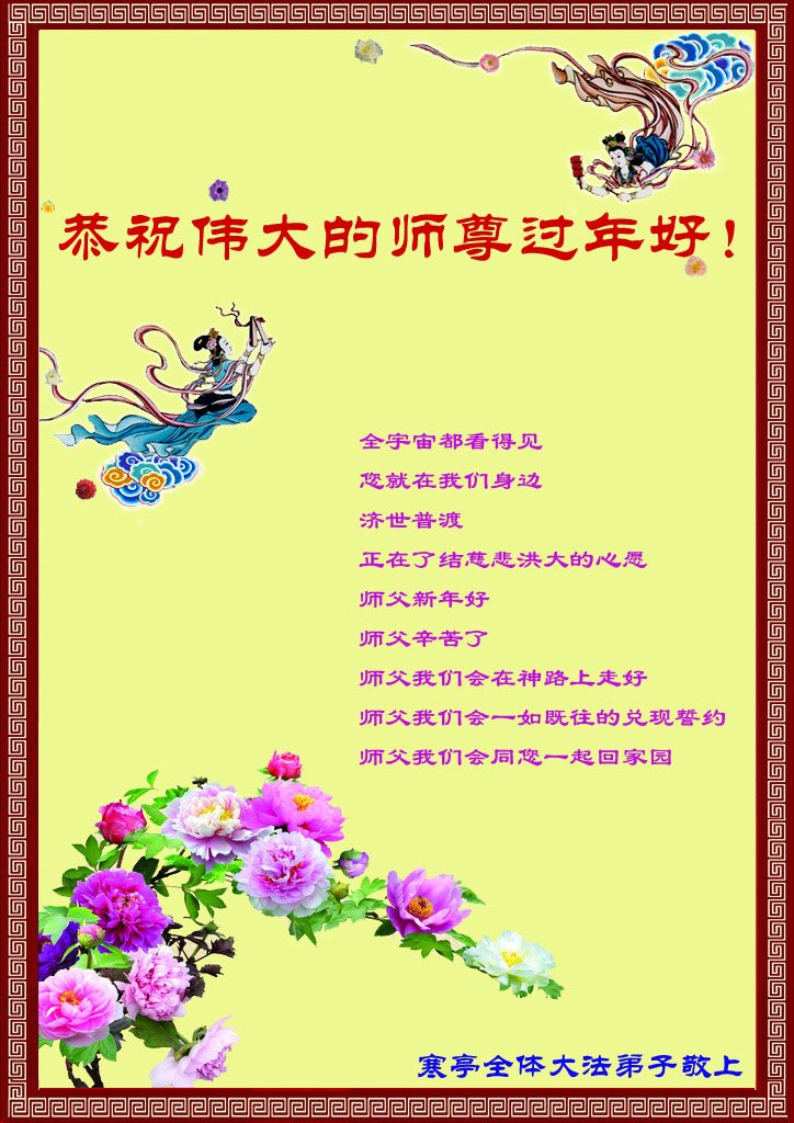 敬爱的师尊您好!我们资料点及学法小组全体弟子敬祝师尊过年好!请师尊放心,弟子们谨遵师尊教诲做好三件事,圆满随师还。