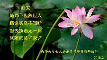 谢谢师尊的慈悲苦度,师尊辛苦了!在新的一年里,弟子们一定听师尊的话,做好三件事,多救人,遇事向内找,做一个合格的大法弟子,圆满随师还。