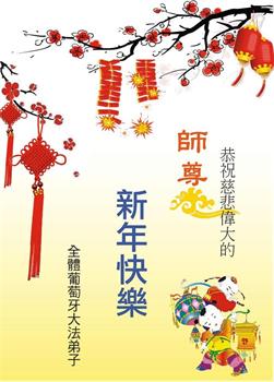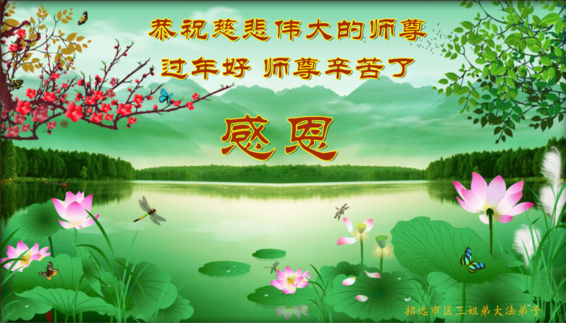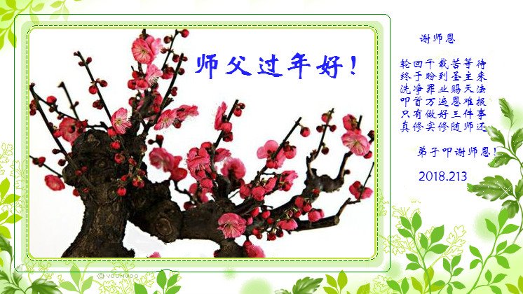 中国的大年即将来临,弟子多么渴望师父能回大陆和您的弟子、得救的众生一起共度佳节!我觉的普天同庆的日子不远了!师父您二十几年来的心血灌注着每一位弟子的心田,弟子明白了人生的意义,身、心得到净化,同时知道救度众生是我们的使命,弟子不会让您失望,弟子会在做好三件事的同时修好自己,不辜负师父的慈悲苦度。祝愿师父戊戌年快乐!